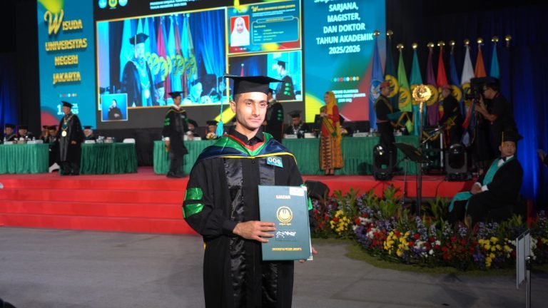EduAsiaNews, Jakarta – Universitas Negeri Jakarta (UNJ) has once again marked a historic milestone by graduating its first international student to receive a fully funded scholarship scheme designated for Palestinian citizens. Mahmoud Ghassan Abdallah Alagha, a student in the Master’s Program in Arabic Language Education at the Faculty of Languages and Arts (FBS) UNJ, was officially conferred his degree on Monday, April 13, 2026, during the UNJ Graduation Ceremony for the 2025/2026 Academic Year (Session I) held at the UNJ Sports Hall.